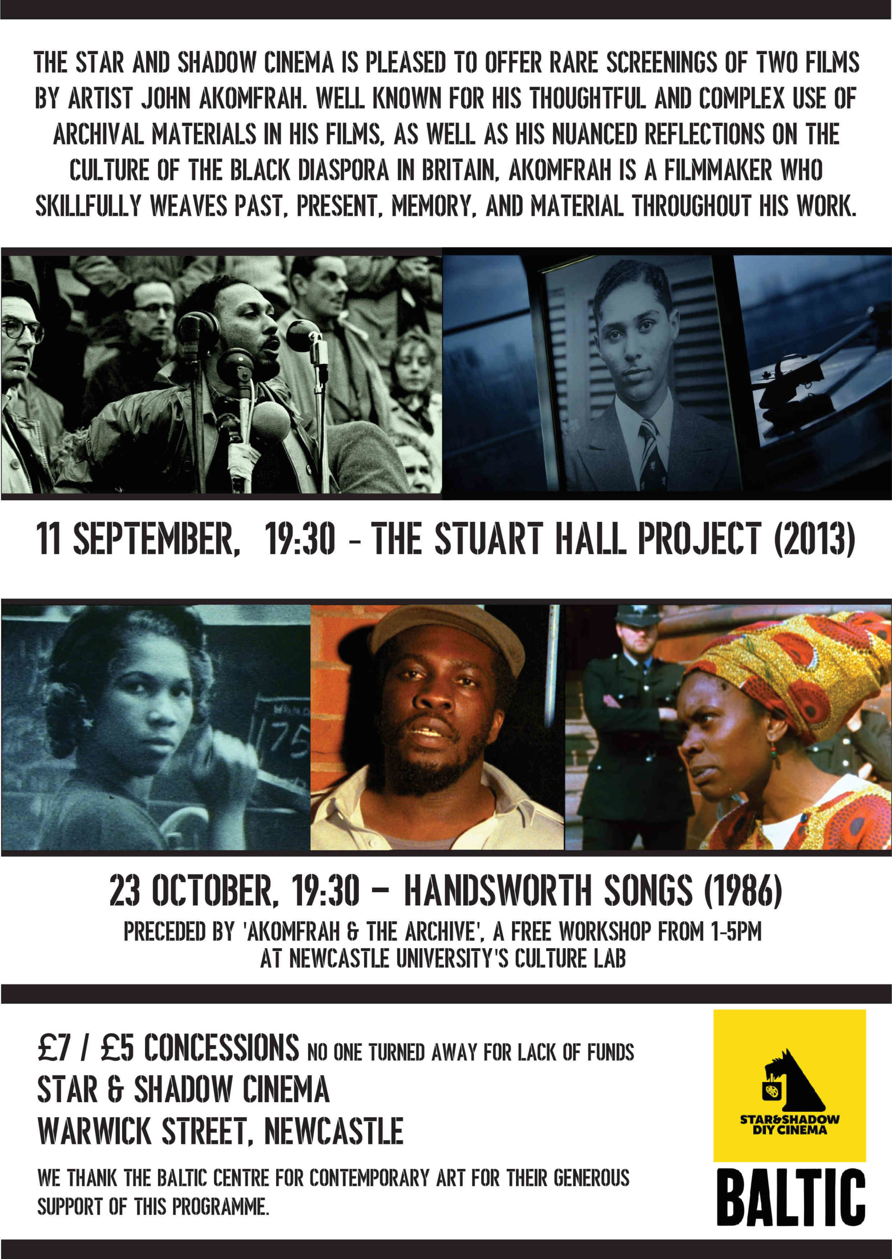 A collaboration with BALTIC and the Newcastle University Culture Lab: my component included two public screenings of Handsworth Songs and The Stuart Hall Project, to complement BALTIC’s exhibition of several of Akomfrah’s multiscreen works and an academic workshop at Newcastle University on archival documentary practices.